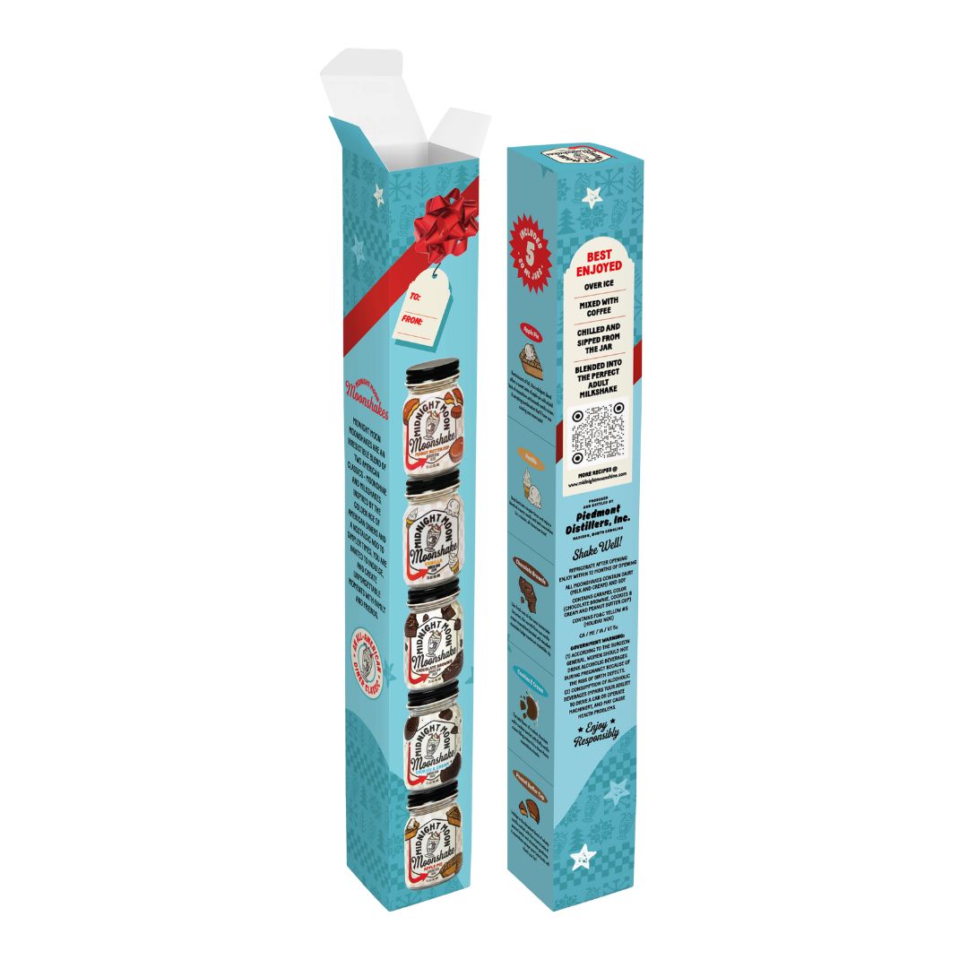 Five decadent Moonshake flavors, one irresistible pack. This sampler of indulgence features our most beloved flavors in portable 50ml mason jars. From nostalgic Apple Pie to rich Chocolate Brownie, these Midnight Moon mini jars are a treat made for sharing (or sneaking into stockings).
