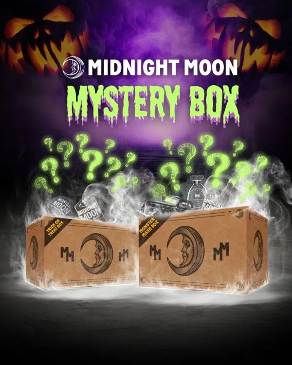When you grab any 750ml jar or 50ml 12-pack of Midnight Moon Moonshine or Moonshake, you can add one of our hauntingly good Mystery Boxes—stuffed with frightful fun and exclusive Midnight Moon gear.