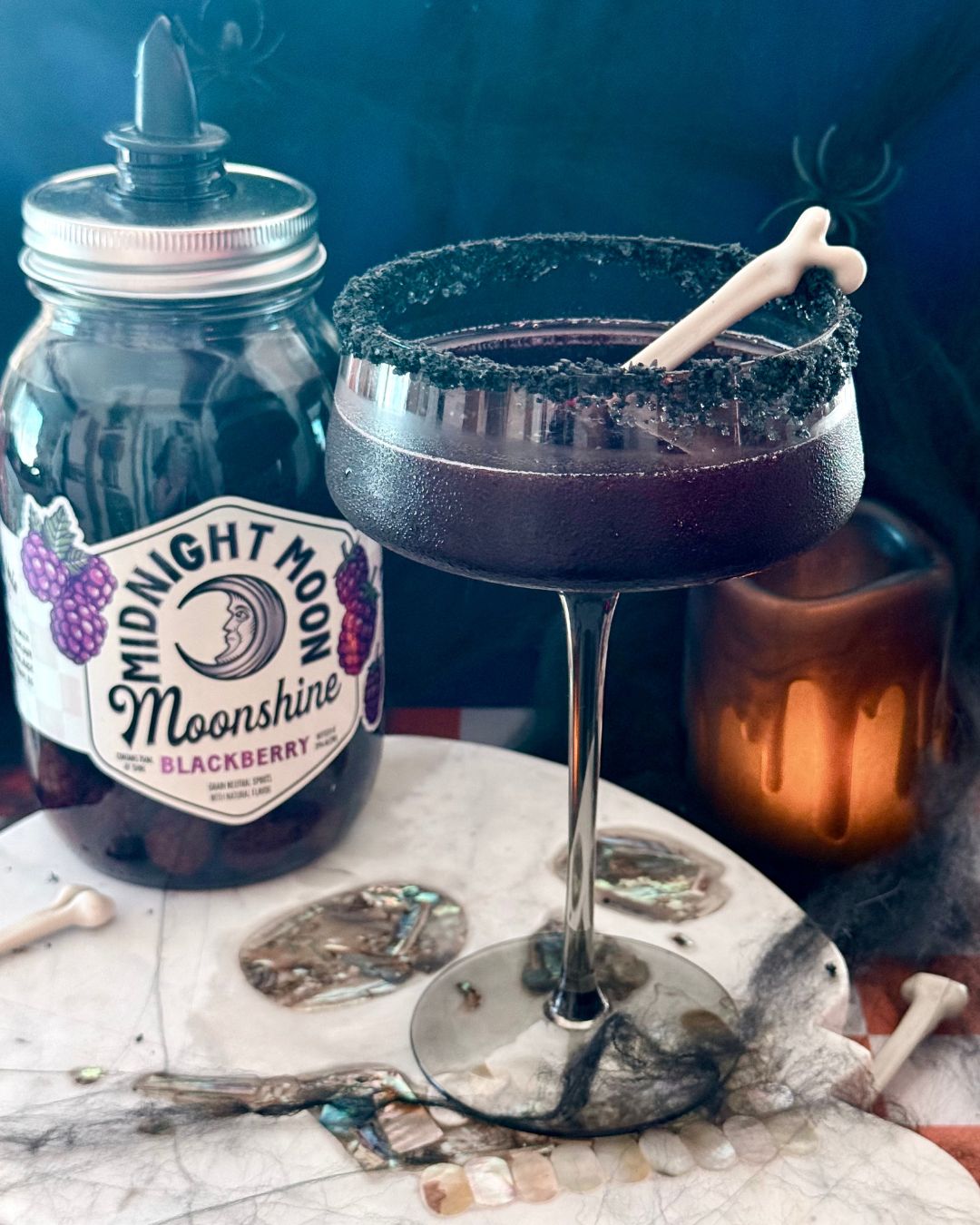 Rim a martini glass with black sugar. In a cocktail shaker combine blackberry moonshine, and cranberry juice OR raspberry liqueur. Shake well with ice, strain into glass, and get spooky!